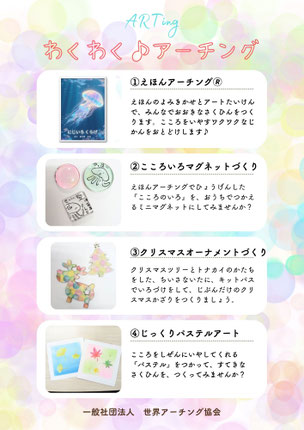 今年は特別企画!アーチング協会代表の絵本出版を記念して『にじいろくらげ』絵本の読み聞かせとアートセラピーを組み合わせた「絵本アーチング🄬」 に加え、「こころいろマグネットづくり」「クリスマスミニオーナメントづくり」「じっくりパステルアート」等、ワックワクなアート体験が出来ますよ(^^)/